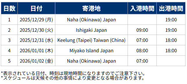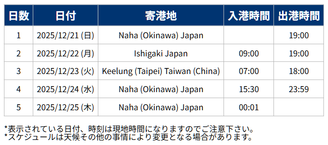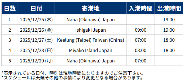 年末年始を那覇、石垣、宮古島、台湾と魅力あふれる寄港地でお過ごしはいかがでしょうか?