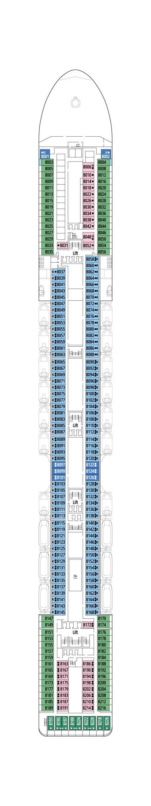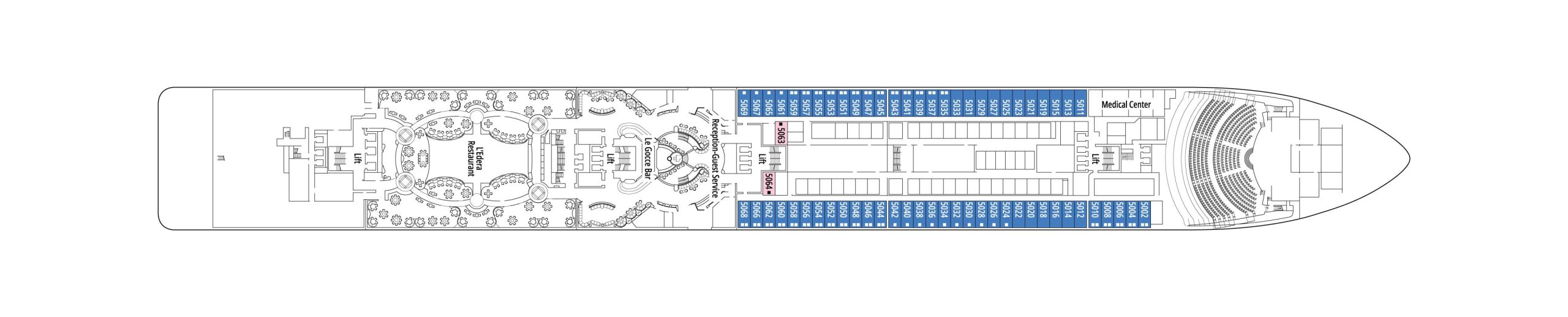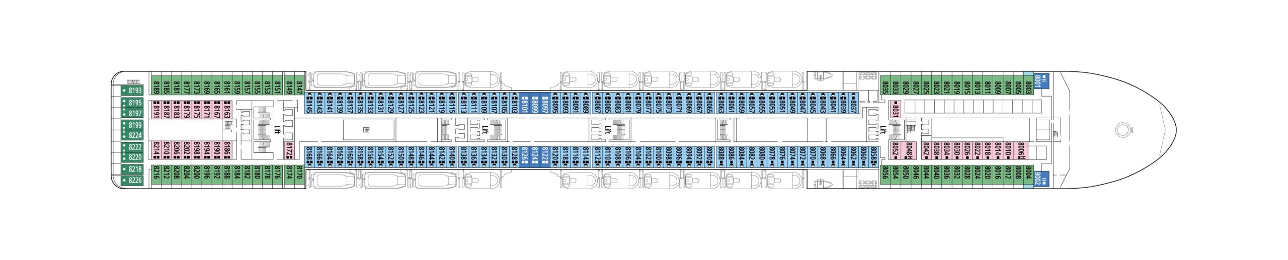 デッキプランをチェックして理想のキャビンを見つけましょう。IMAのオンライン予約では、以下と同じデッキプランを確認しながら部屋を選ぶ事ができます。