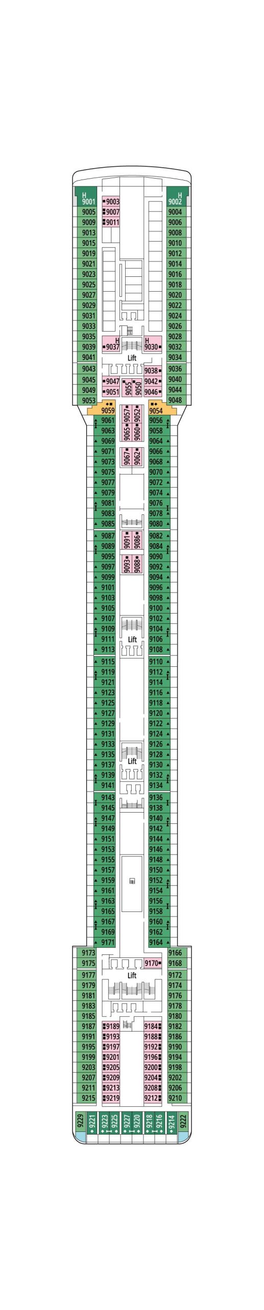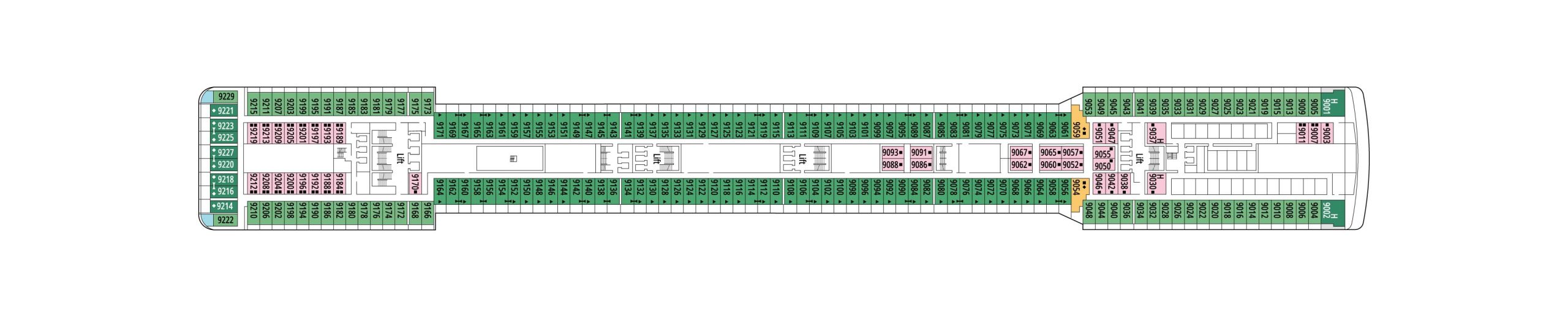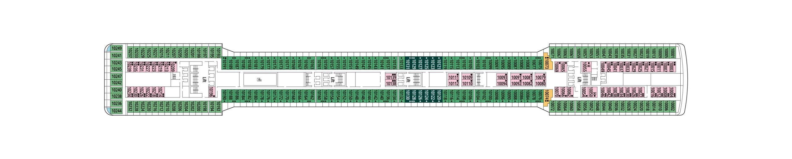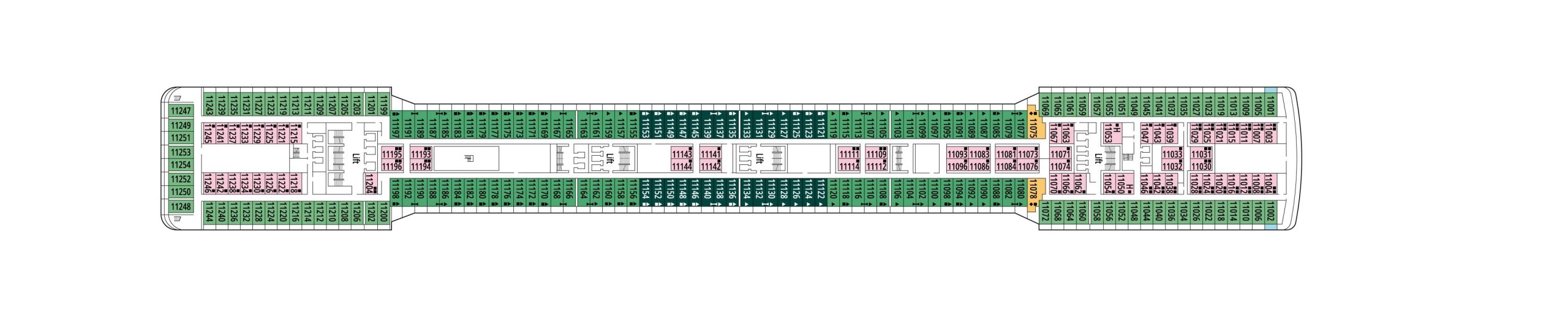 デッキプランを使って、理想のキャビンを選びましょう。プランを見れば場所が正確に把握でき、色分けによってキャビンの種類が区別されます。