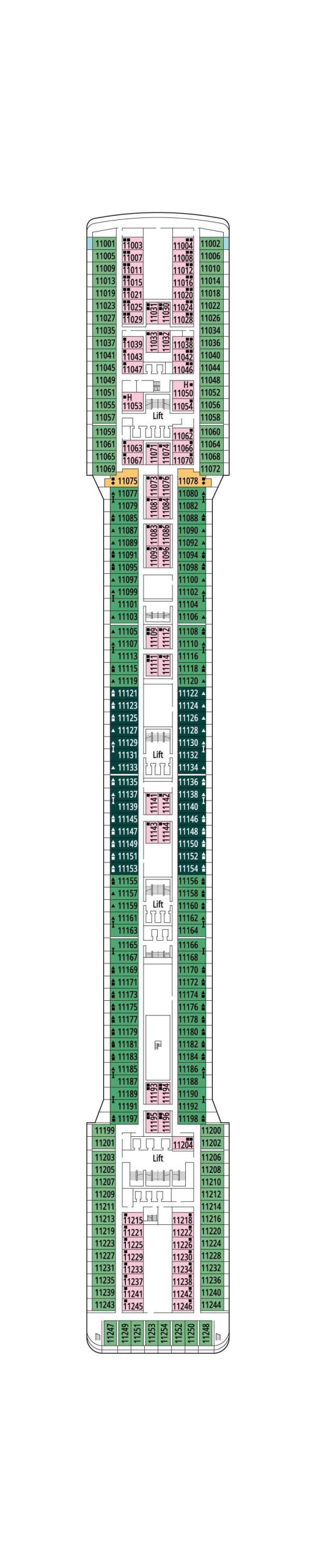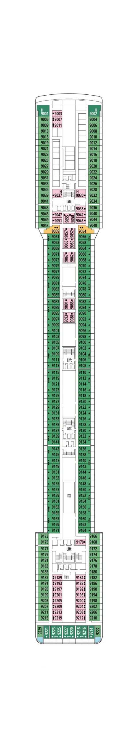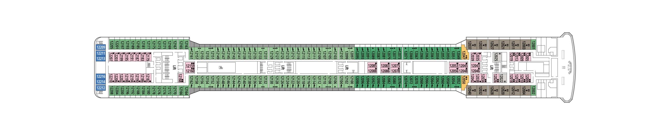 デッキプランを使って、理想のキャビンを選びましょう。プランを見れば場所が正確に把握でき、色分けによってキャビンの種類が区別されます。