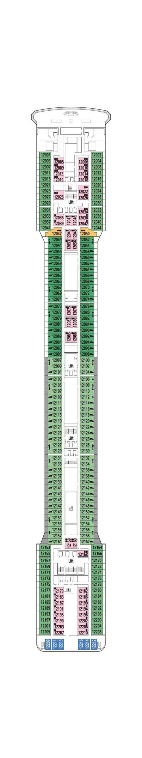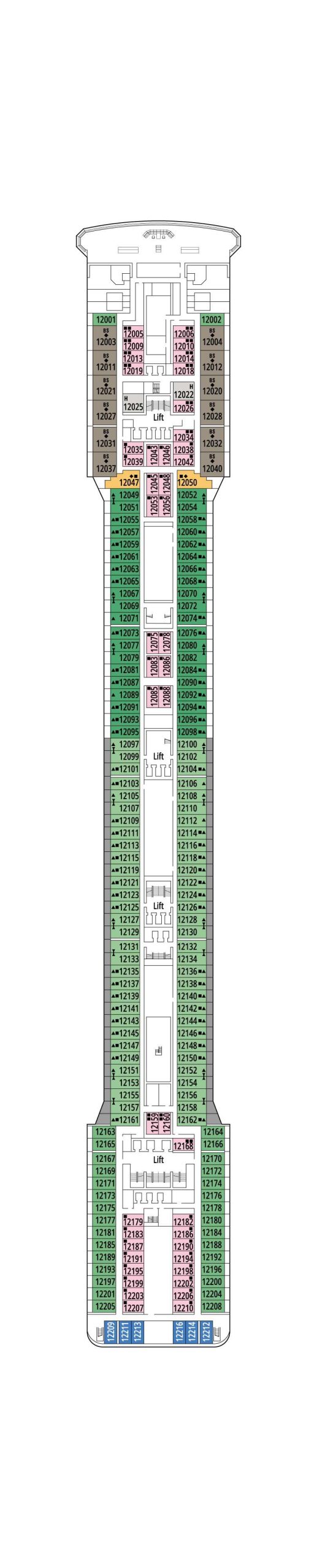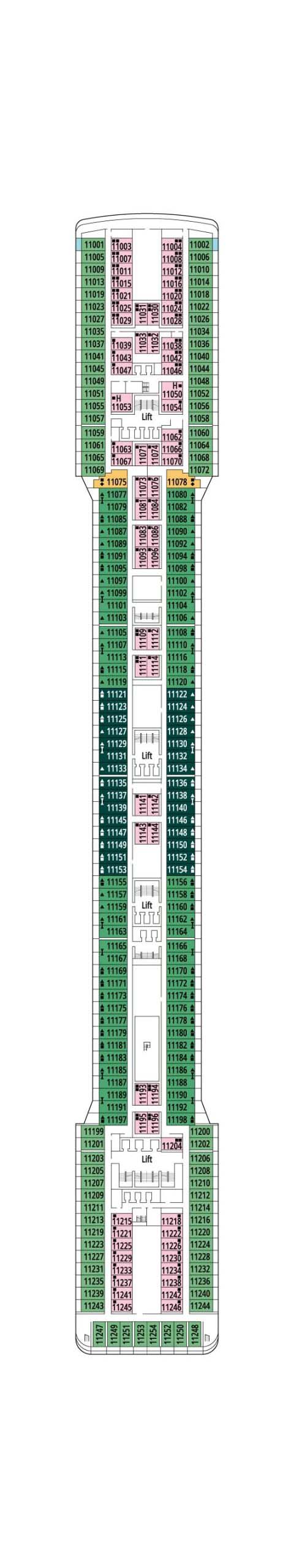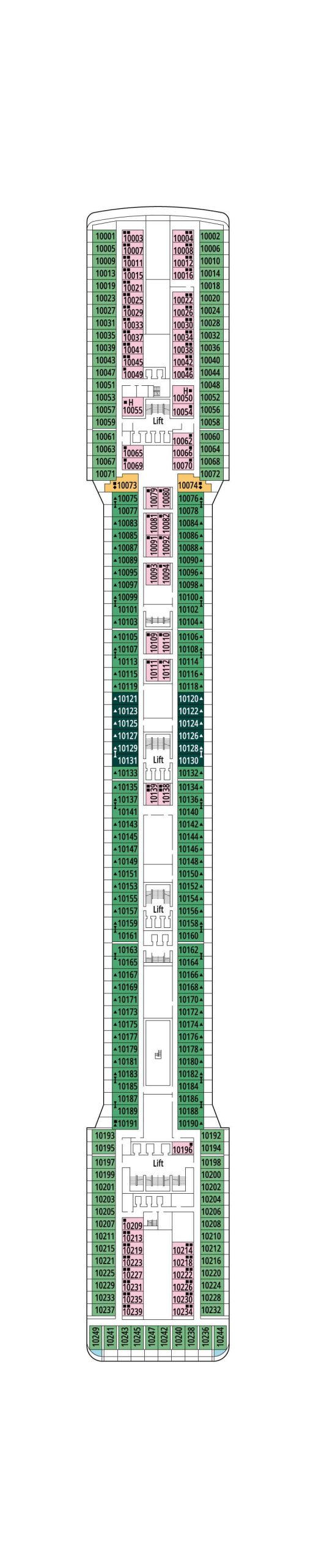 デッキプランを使って、理想のキャビンを選びましょう。プランを見れば場所が正確に把握でき、色分けによってキャビンの種類が区別されます。