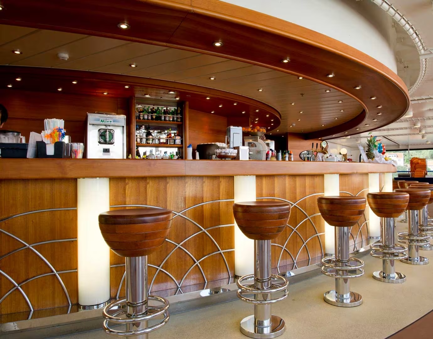お客様に思い出に残るドリンク体験を提供するため、船内にある11のテーマ別バーとラウンジでは、厳選された高級ワインや世界各国のビールに加え、定番カクテル、プレミアムスピリッツ、そして幅広い種類のノンアルコール飲料や軽食をご用意しております。