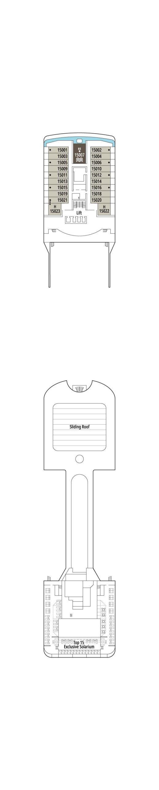 • 全てのキャビンはご要望によりツインに変更可能なダブルベッドが備えられています。(但しお身体の不自由なお客様対応キャビン及びキャビン15022及び15023は除く)